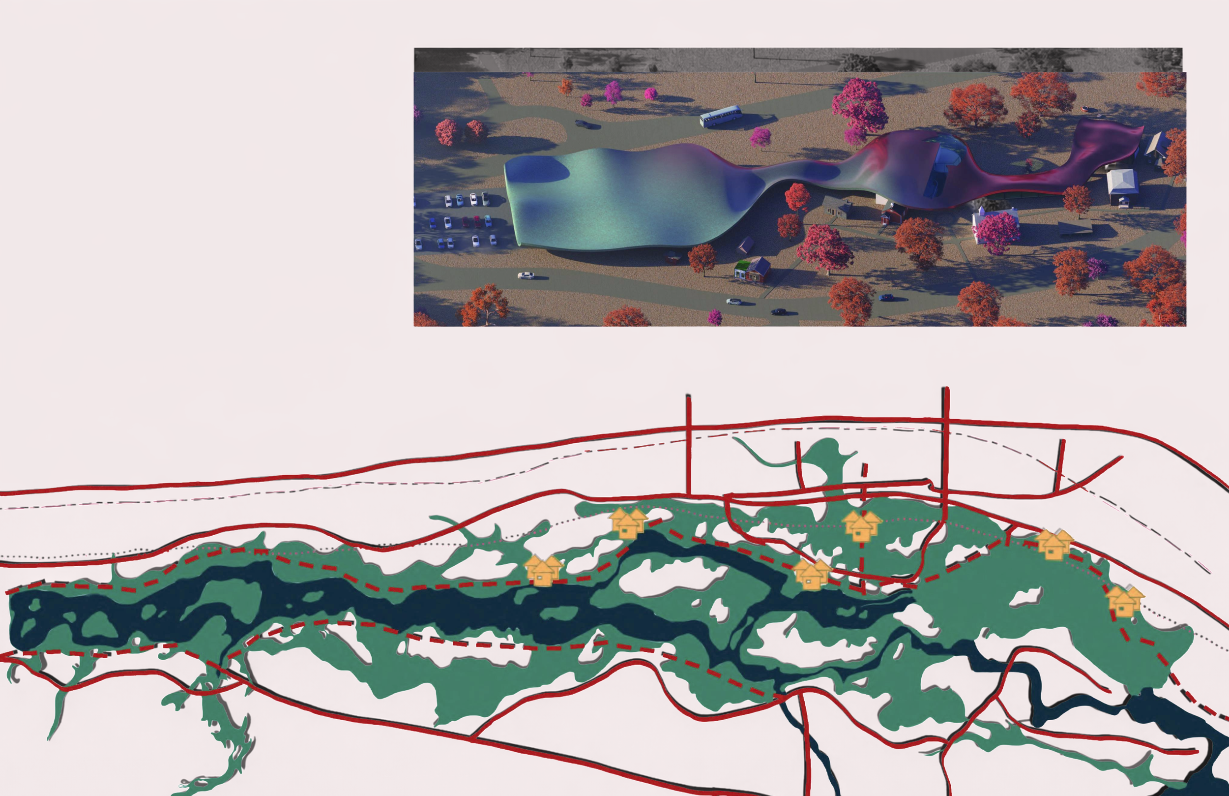 Completed in 1959, the St. Lawrence Seaway linked the Great Lakes to the Atlantic but displaced over 6,500 people when ten Ontario communities—the Lost Villages—were flooded in 1958. The Lost Villages Museum in Ault Park near Long Sault preserves relocated heritage buildings and remembers these communities. Using themes of submersion and resurfacing, the project explores loss, memory, and the costs of progress.