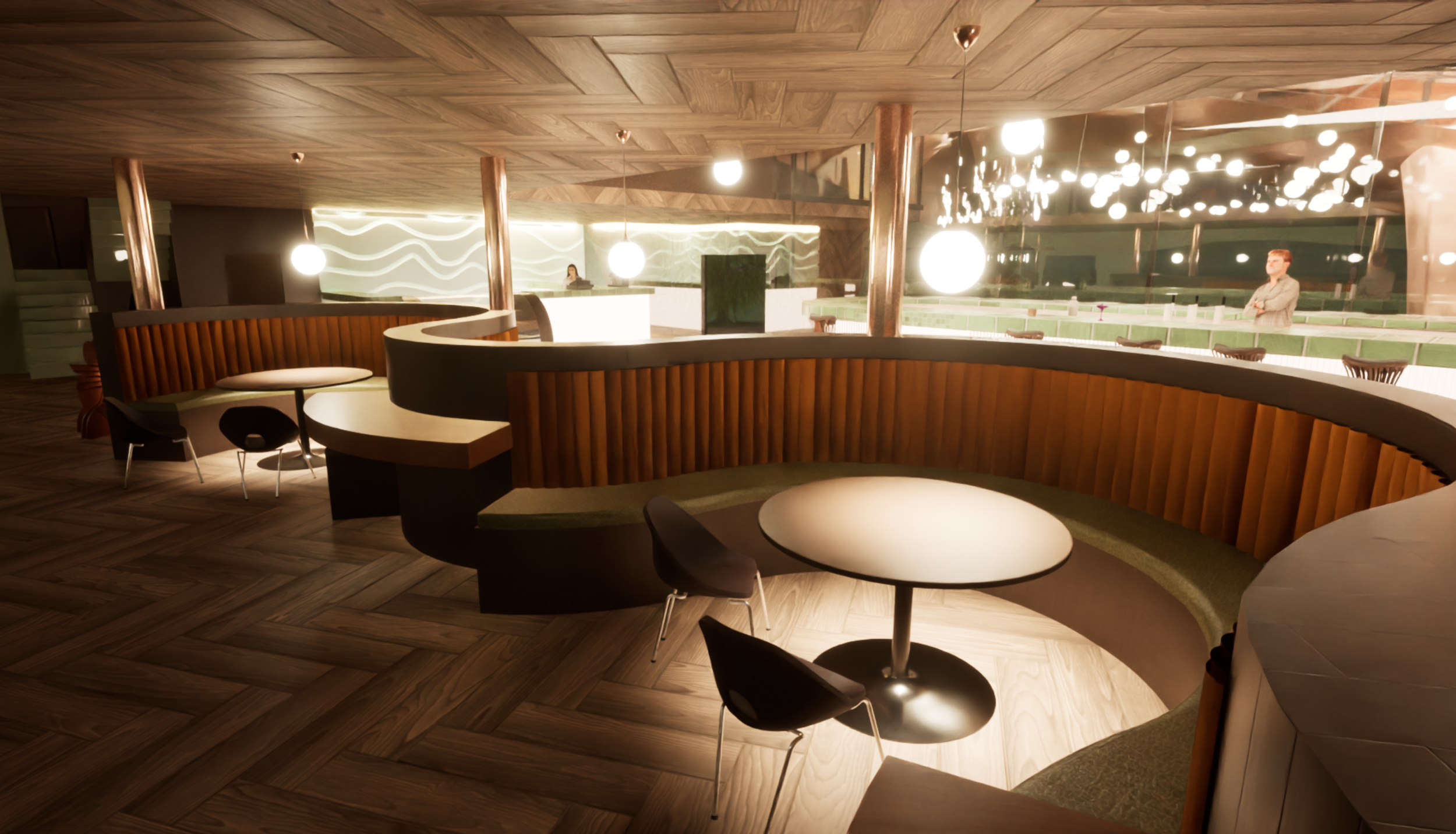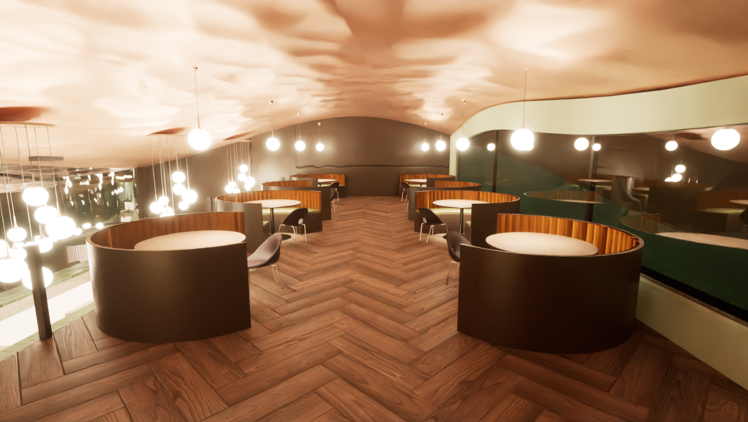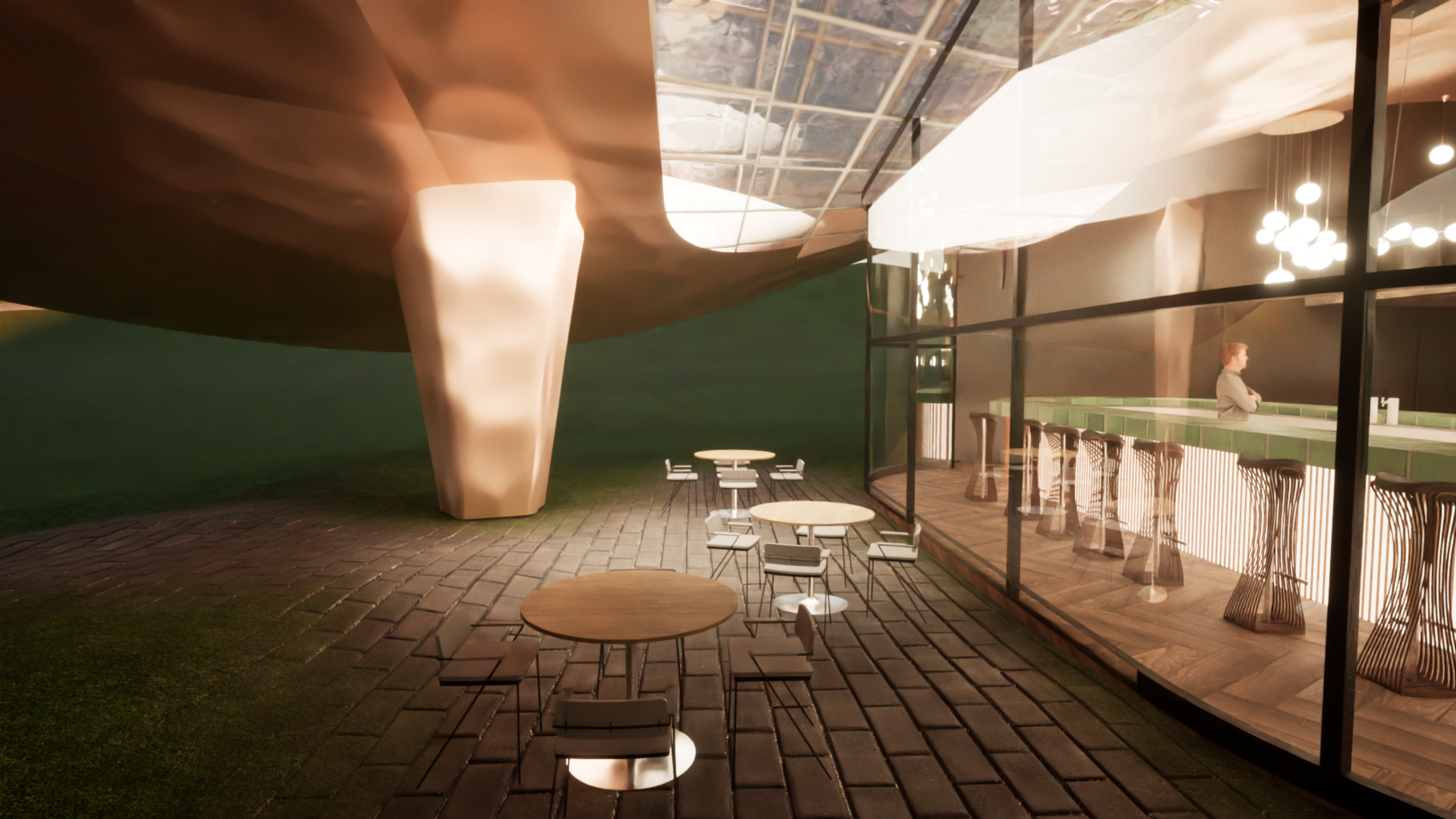 ❋ Warmth Beneath the SurfaceInside, the atmosphere is warm and immersive. Natural textures, reclaimed materials, and a palette inspired by earth and river tones create a calming, intimate environment that contrasts the monumental force of water with the delicate act of remembrance. Lighting is subdued in the evening, transforming the space into a reflective dining setting, while daylight hours offer a welcoming stop for casual bites or seated meals.