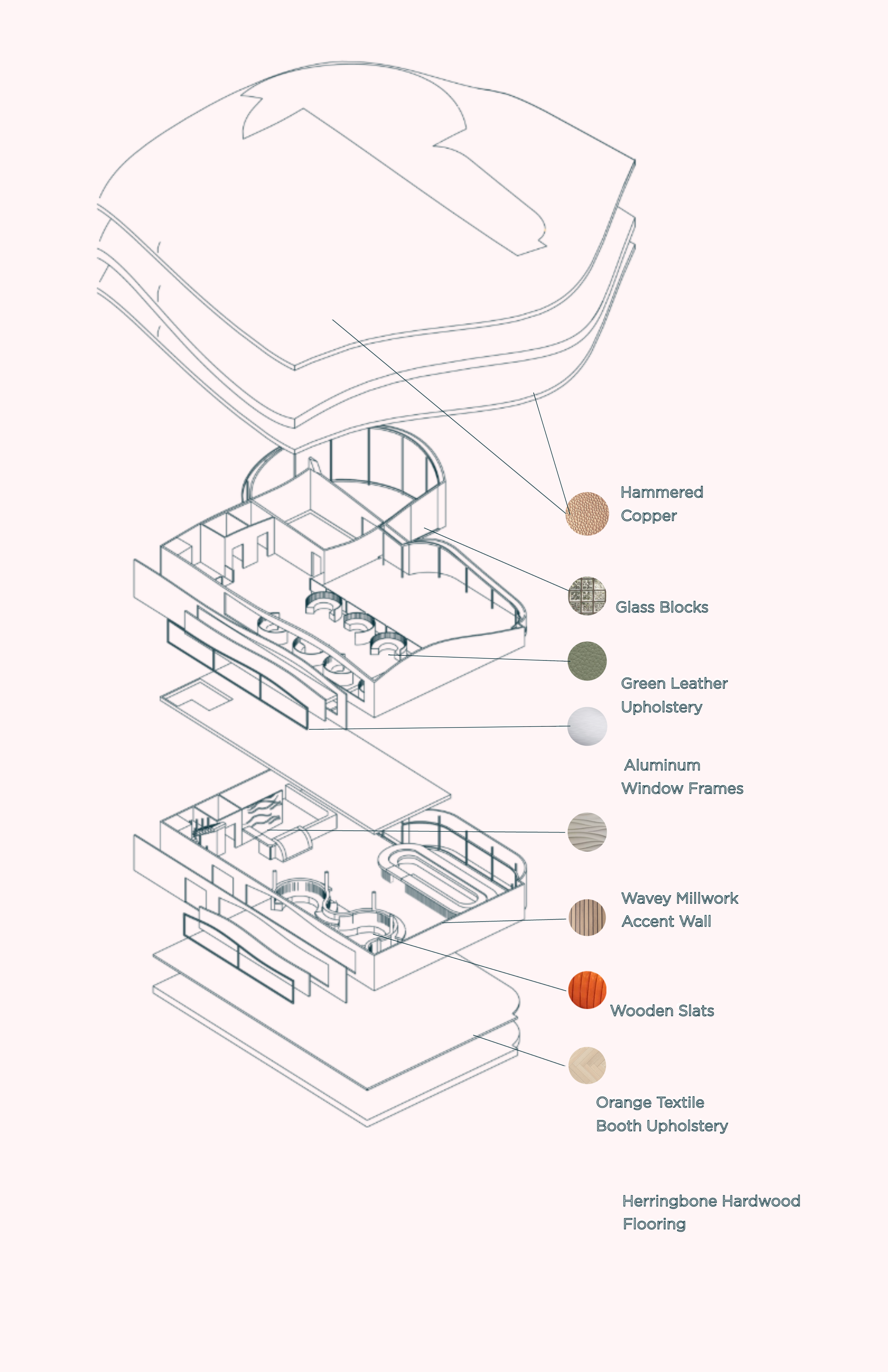 ❋ Architecture in MotionThe building’s most striking element is its hammered copper roof, which mimics the cresting motion of a wave. It overtakes the façade, creating a bold visual gesture that symbolizes the rising waters that once engulfed entire communities. This fluid motif carries into the interior, where a custom reception desk formed from wave-shaped wooden slats and a wavy millwork feature wall behind the grab-and-go counter reinforce the sense of movement and memory.
